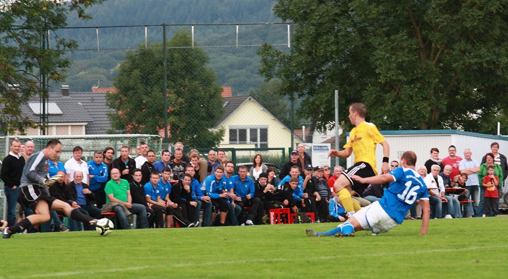 Am vierten Spieltag der noch jungen Saison kam es zu dem Aufeinandertreffen der SG Wasser/Kollmarsreute und des FV Herbolzheim. Zweier Mannschaften, die von vielen Experten als Aufstiegskandidaten gehandelt werden. Diesem Ruf wurden auch beide Mannschaften an diesem Tag gerecht. Die vielen Zuschauer auf dem Sportplatz in Kollmarsreute sahen über 90 Minuten eine spannende Partie auf sehr hohem Niveau. Bei der SG konnte Trainer Thomas Reger auf Rückkehrer Kevin Gaeß und auf Lukas Dümmig zurück greifen. Beide Spieler standen auch in der Startformation. Leider musste kurzfristig Fabian Hodel krankheitsbedingt passen. Ebenfalls nicht zur Verfügung standen Kapitän Matthias Bürkle und Sergej Kohl ( beide im Urlaub ). Die SG starte mit einem druckvollen Pressing und man drängte früh die Gäste in die Defensive. Eine erste Chance durch Artjom Gordijenko konnte der Torhüter aus Herbolzheim gerade noch abwehren.